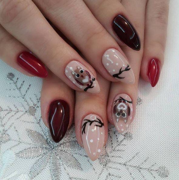 Soft nude nails paired with deep red and green are decorated with charming woodland creatures, fun and snowy branches for a calm, storybook winter Christmas vibe.