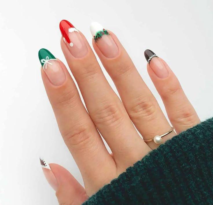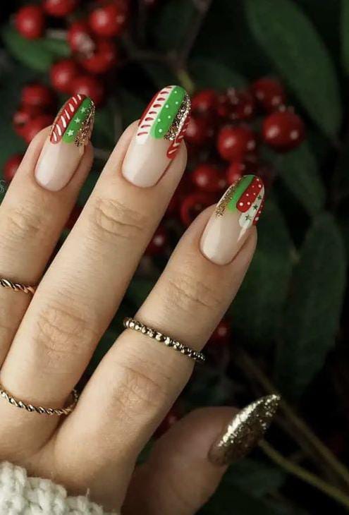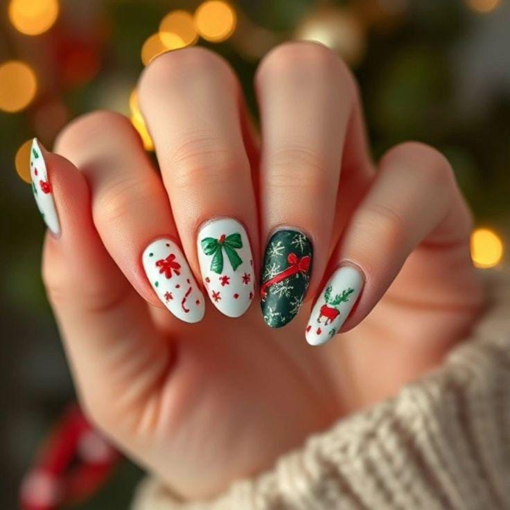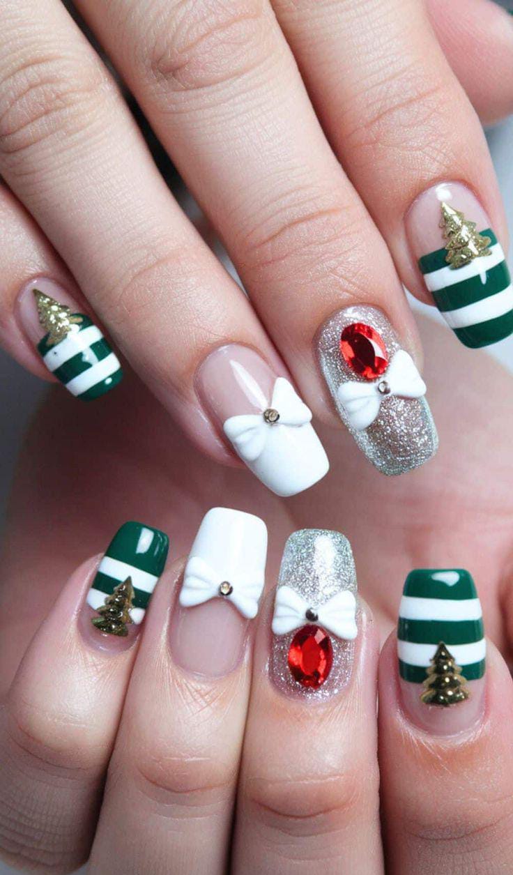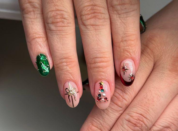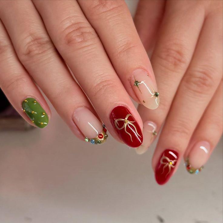 A mix of soft nude, deep red, and Christmas green creates a chic holiday palette, accented with delicate metallic bows and tiny rhinestones. The look is festive yet classy, with a hint of fun charm.