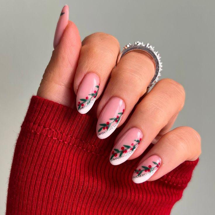 A soft pink base paired with delicate holly leaf accents and subtle silver-lined white tips gives this design a fun, elegant Christmas feel that’s festive without being too bold.