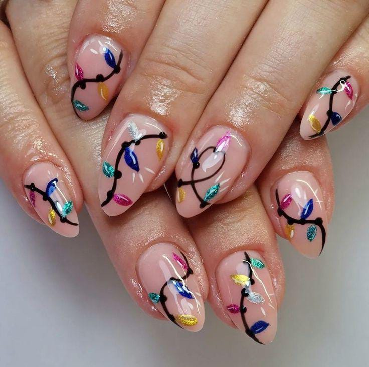 A clear nude base is wrapped with bright, multicolored string-light artwork, giving the nails a cheerful, Christmas festive glow that feels lively and fun.
