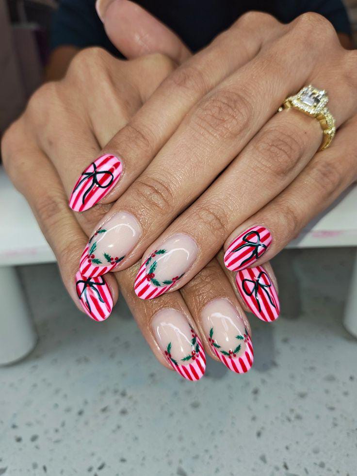 Red-and-pink candy-cane stripes paired with tiny green wreaths and black bows make this design look like cute fun Christmas presents wrapped right on the nails.