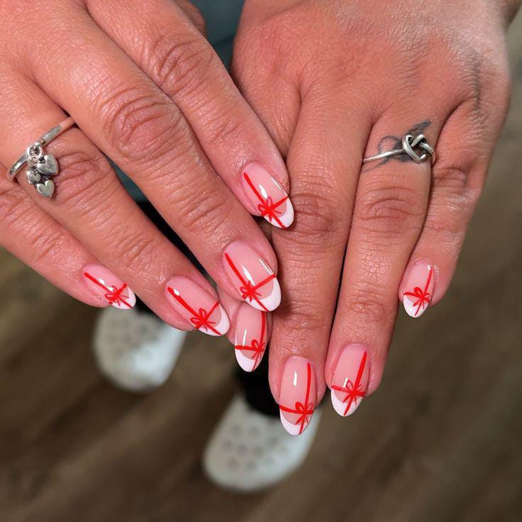 These nails feature a soft nude base with crisp white French tips, decorated with bright red ribbon-style lines and tiny bows, giving the whole look a cute wrapped- Christmas present vibe.