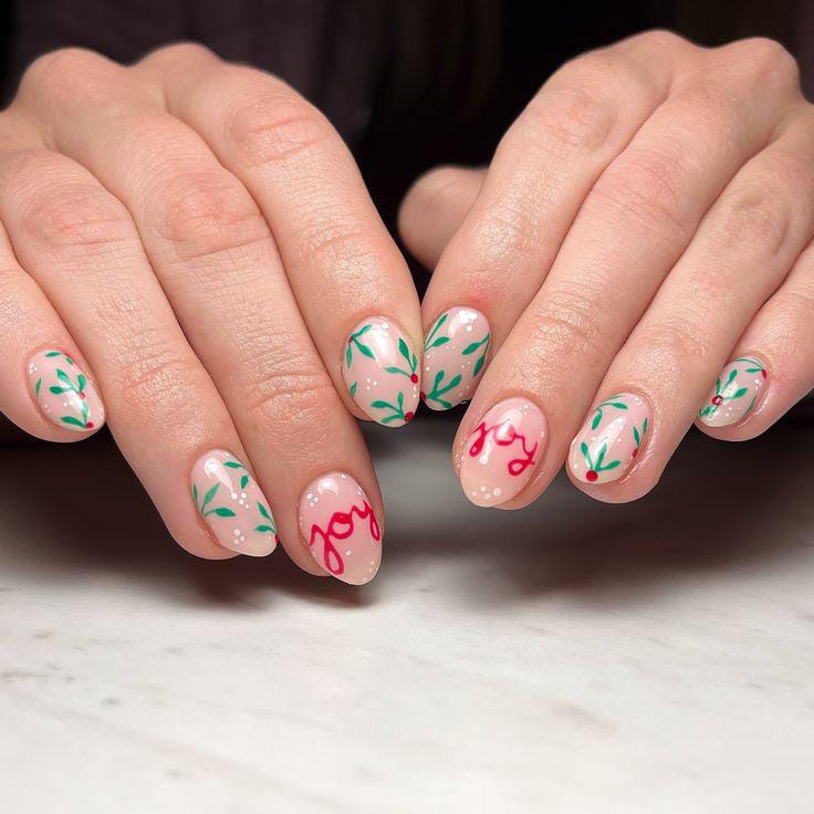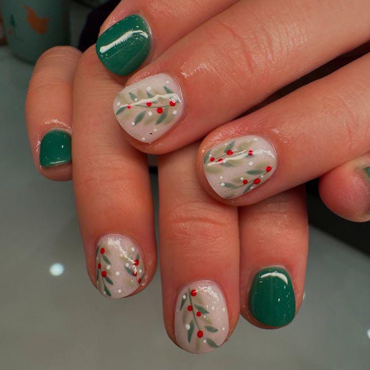 This design pairs deep green solid nails with light, wintry accents featuring leafy branches, red and white dot berries, giving a fun, fresh woodland Christmas feel.