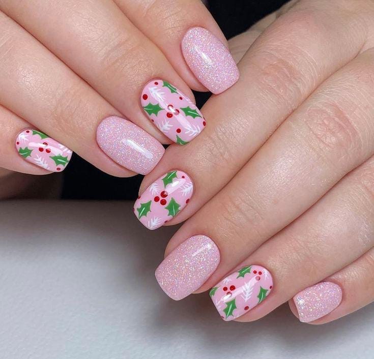 A blend of soft pink glitter nails and holly-patterned accents creates a playful, cheerful Christmas look with bright green leaves and red berries standing out against the pastel base.