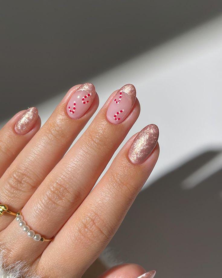This look mixes soft pink bases with bold red accents, pairing glittery red polish with playful peppermint–swirl designs for a fun and festive Christmas holiday vibe.