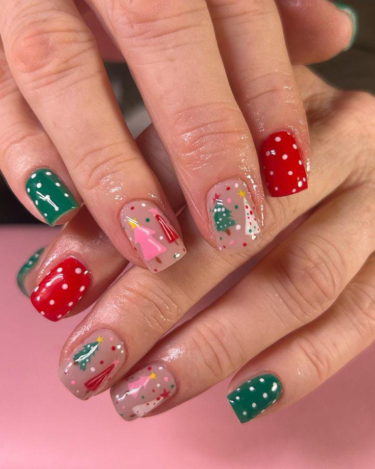 White nails with green Christmas trees and red-green polka dots create a crisp, cheerful look that feels both cute, fun and festive. The little gem-like accents and gold details add a touch of sparkle.