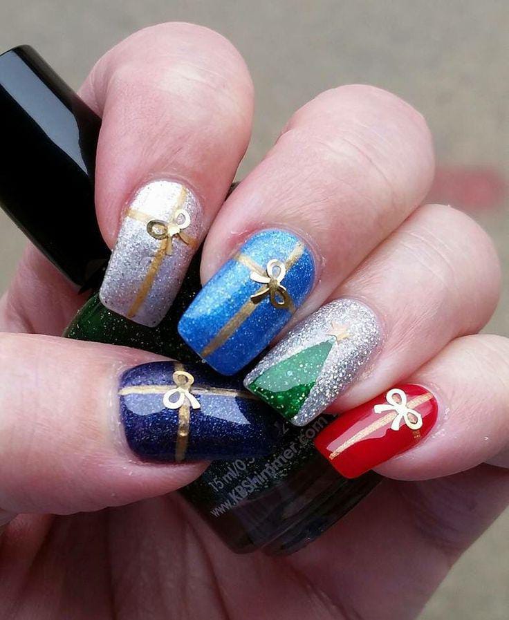 This design mixes glittery shades of blue, green, red, and silver with thin gold lines and tiny bow accents, giving each nail a festive, gift-like look. It feels playful and colorful, perfect for anyone who loves bright Christmas vibes.
