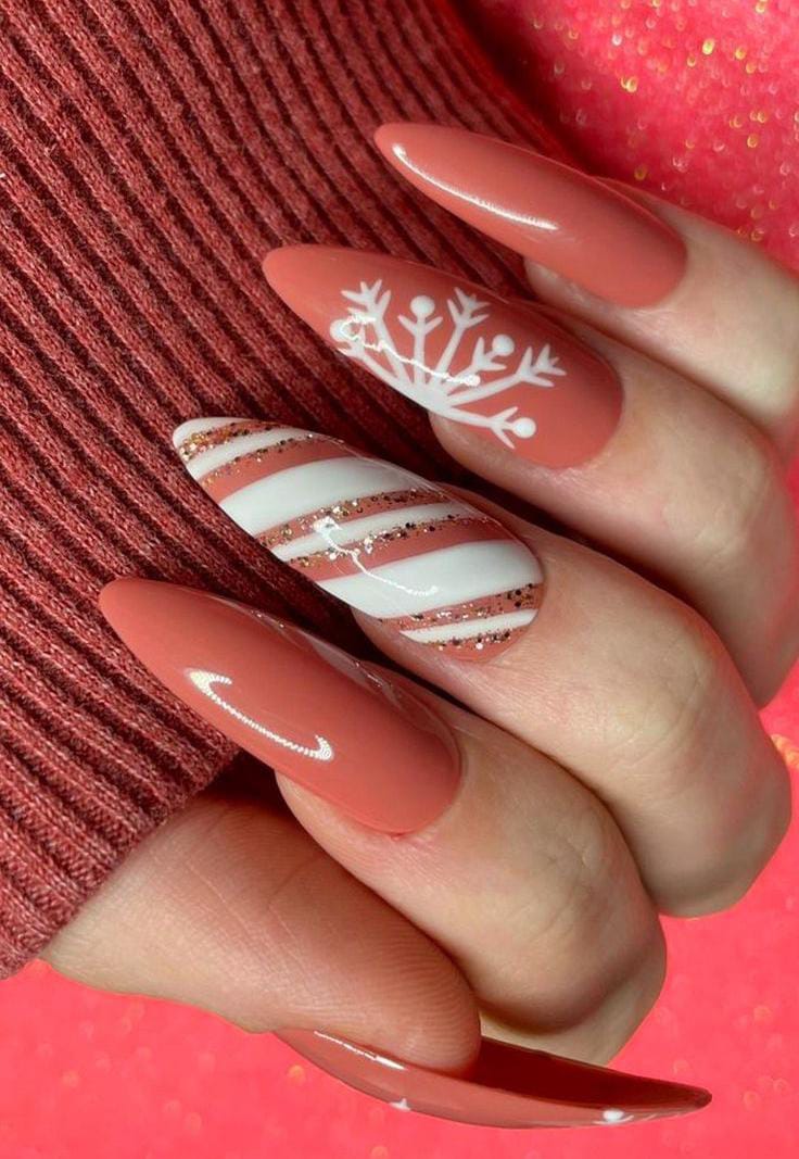 Warm coral-peach tones meet crisp white snowflakes and peppermint-striped accents, giving a cozy yet wintery feel. It’s bold, trendy, and perfect for someone who likes Christmas holiday nails with a modern fun twist.