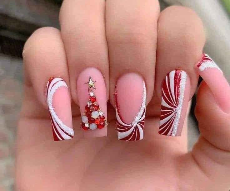 Red and white swirls mimic peppermint candy, paired with an accent nail featuring a rhinestone Christmas tree topped with a gold star. This design is bright, fun, and full of classic holiday cheer.