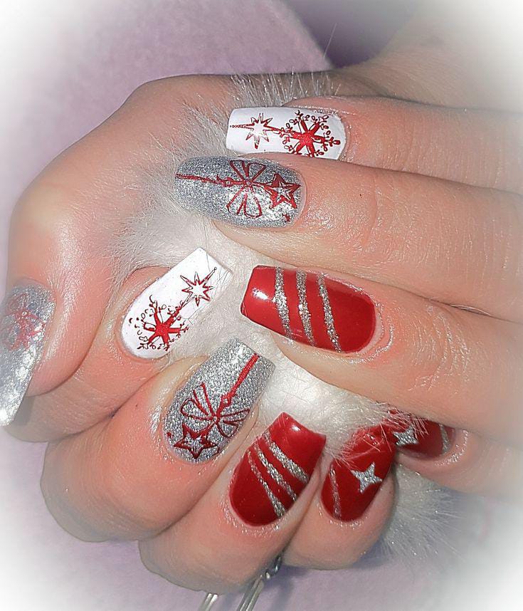 Bright red nails pair with glittery silver tones, snowflake accents, and simple white stripes for a Christmas festive fun look that blends tradition with a bit of glam.