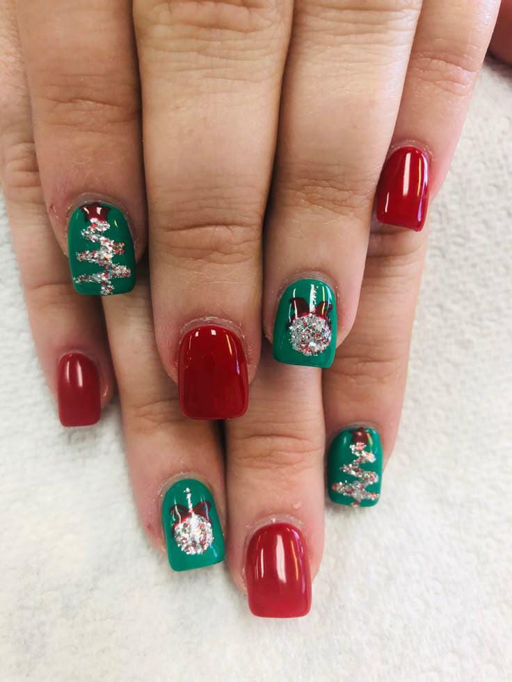 Classic red and green nails get a festive upgrade with sparkling glitter trees and ornament-style accents. The look is simple, bold, and fun Christmas-themed.