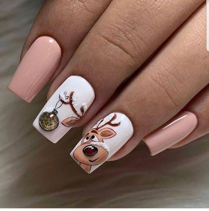 This design mixes soft nude nails with playful white accent nails featuring an adorable cartoon reindeer and a sparkly ornament, giving the whole look a sweet and fun Christmas vibe.
