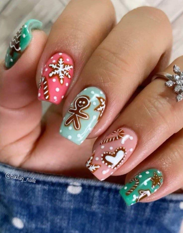 Bright pastel shades decorated with gingerbread-style outlines, candy canes, snowflakes, and hearts create a fun, cookie-inspired Christmas look that feels festive and cheerful.