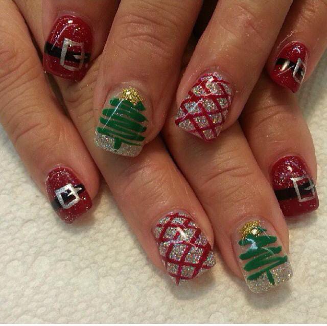 A bold blend of glittery red, gold, and silver nails with Santa belt accents and simple Christmas tree art, making the set look vibrant, fun, and full of holiday spirit.