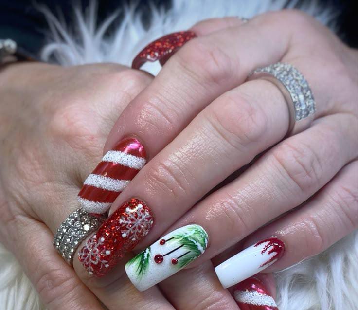 Shiny red and white stripes, glittery red nails, delicate snowflakes, and a soft greenery accent nail come together for a glamorous yet playful Christmas candy-themed look.