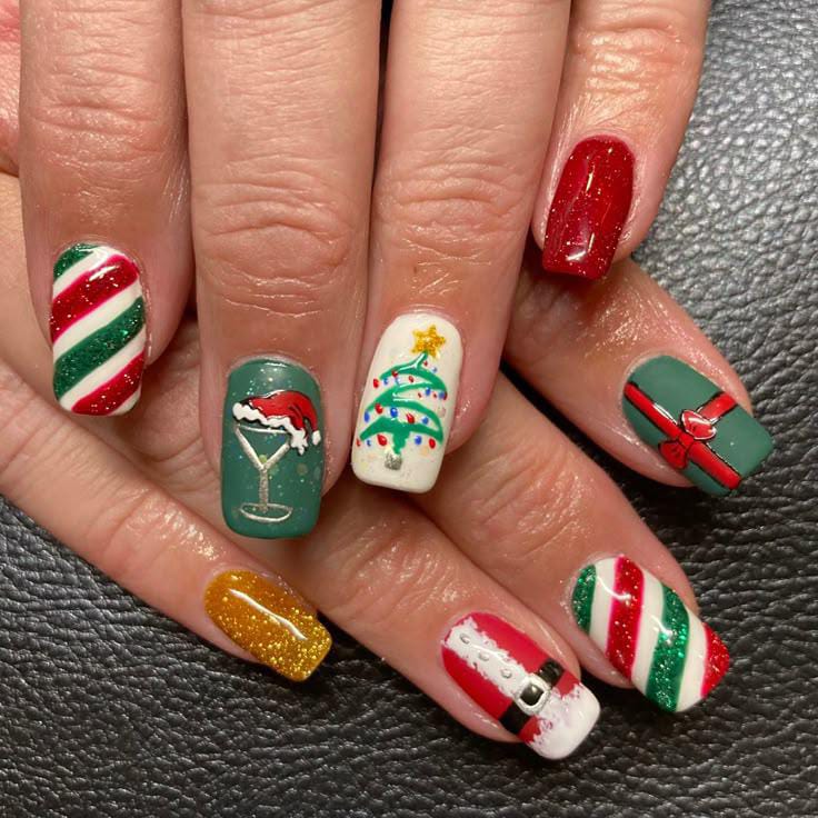 This set features a lively mix of red, green, white, and gold with designs like candy stripes, gift boxes, a Christmas tree, and a festive martini, creating a fun, party-ready Christmas manicure.