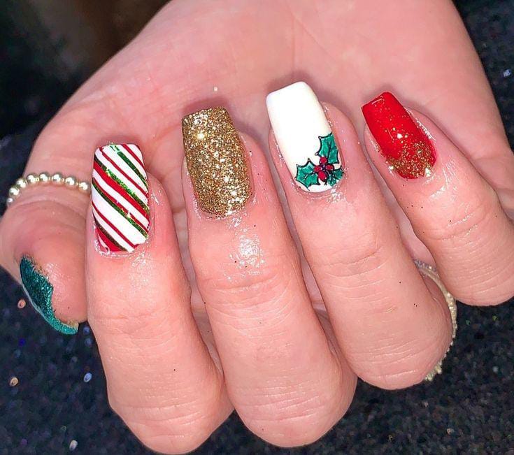 A fun mix of candy-cane stripes, sparkling gold glitter, crisp white polish, and a small holly accent creates a cheerful and slightly glamorous Christmas vibe.