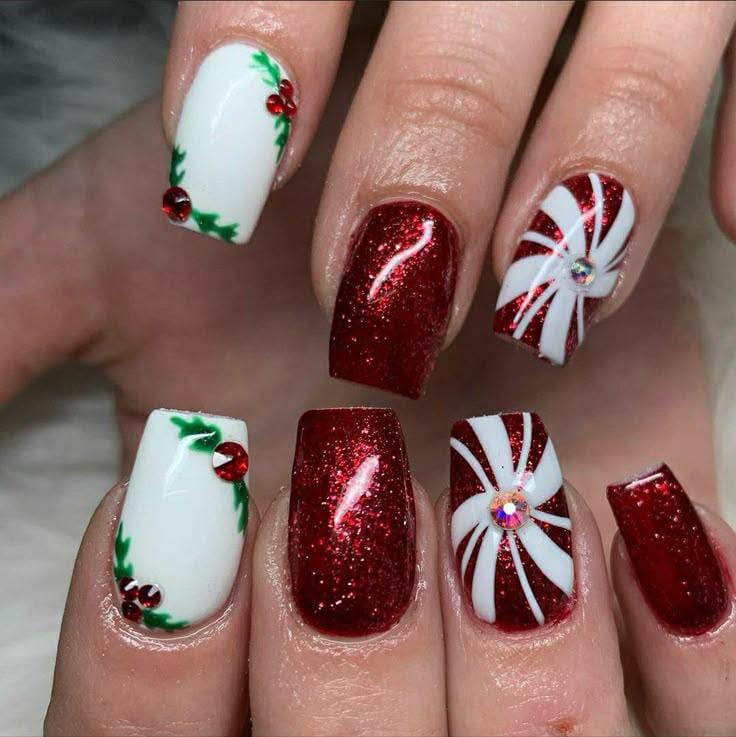 Rich red glitter nails pair with crisp white peppermint-swirl designs and holly accents, giving the whole set a sweet, fun and candy-inspired Christmas holiday feel.