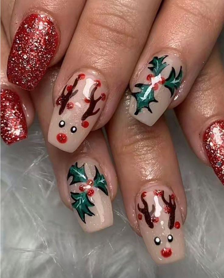 Cute reindeer faces and holly leaf accents are combined with sparkling red glitter nails, creating a fun, playful, and slightly whimsical Christmas look.