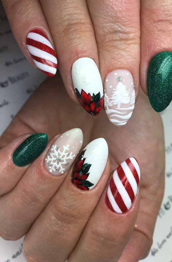 A mix of candy-cane stripes, glittery green polish, snowflakes, poinsettia art, and a white winter tree creates a cheerful, classic Christmas set full of fun holiday charm.