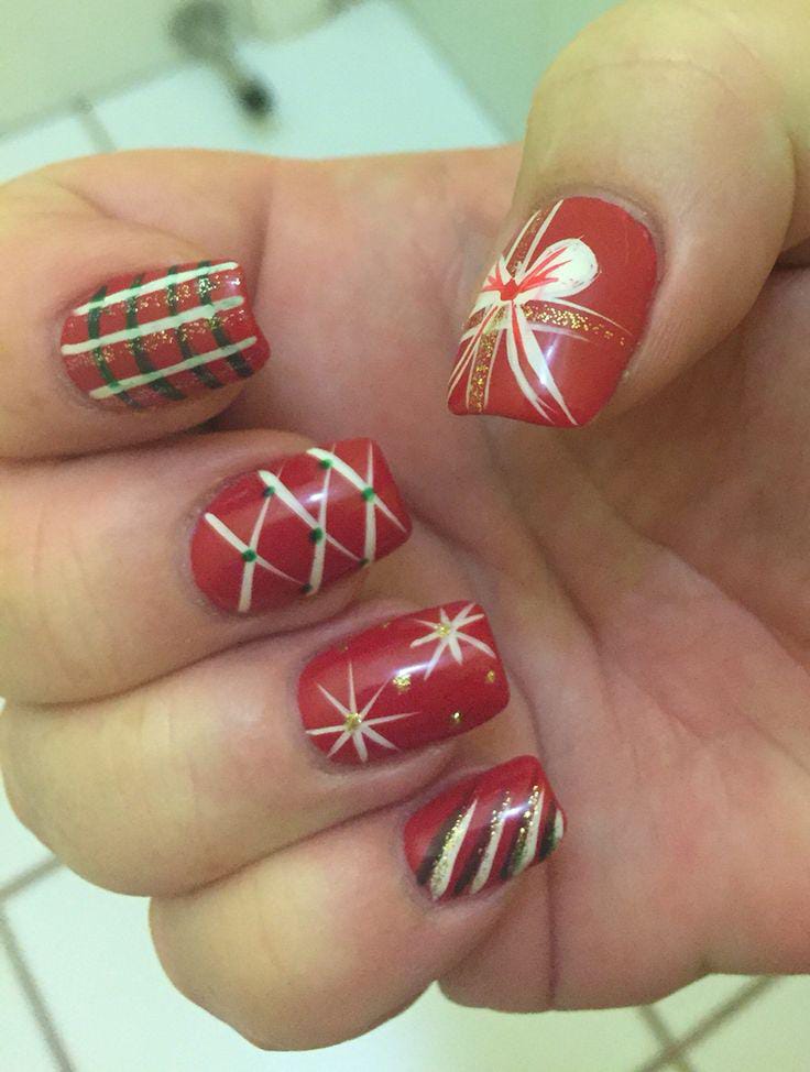 This design uses a bold red base decorated with ribbon-like stripes, stars, and plaid patterns, giving the nails a wrapped-present look. The mix of gold accents and crisp lines adds a cheerful, fun classic Christmas feel.