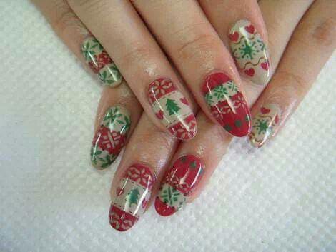 This set features red and neutral tones covered in sweater-inspired prints like snowflakes, hearts, and tiny trees, giving the nails a cozy, knitted-holiday-sweater vibe. The patterns feel fun, warm, nostalgic, and perfectly wintry.