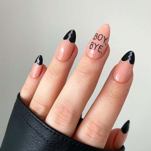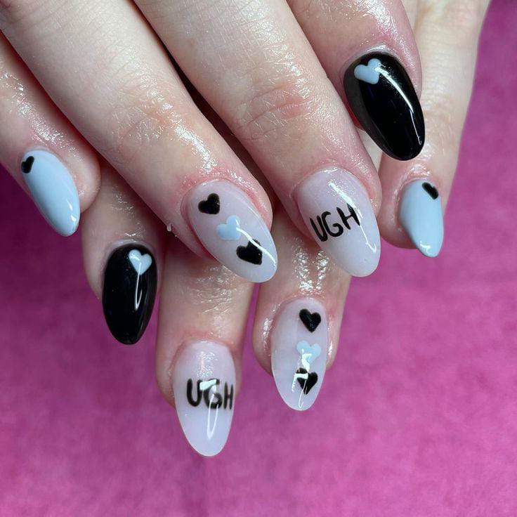 Soft nude nails are paired with bold black broken heart tips and a cheeky text accent that adds attitude. The overall look feels modern, edgy, and playful with a fun Valentine’s twist.