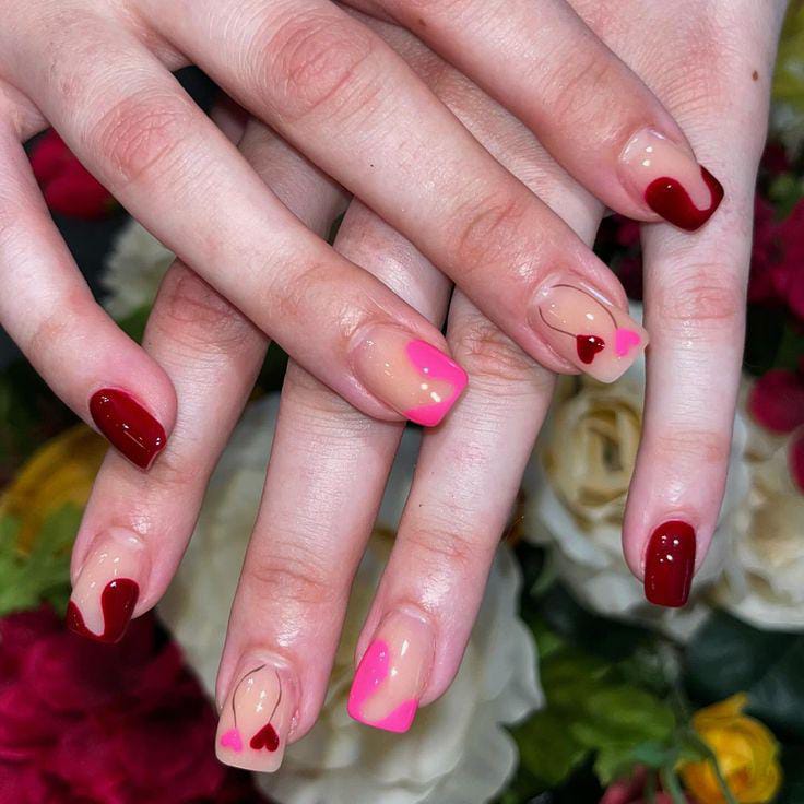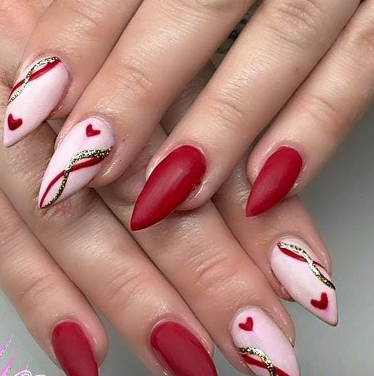 Soft pink and deep red nails are mixed with delicate heart accents and flowing ribbon-style lines. The design feels romantic and polished with a touch of elegance, fun Valentine’s look.
