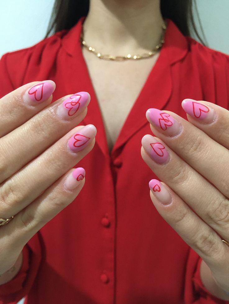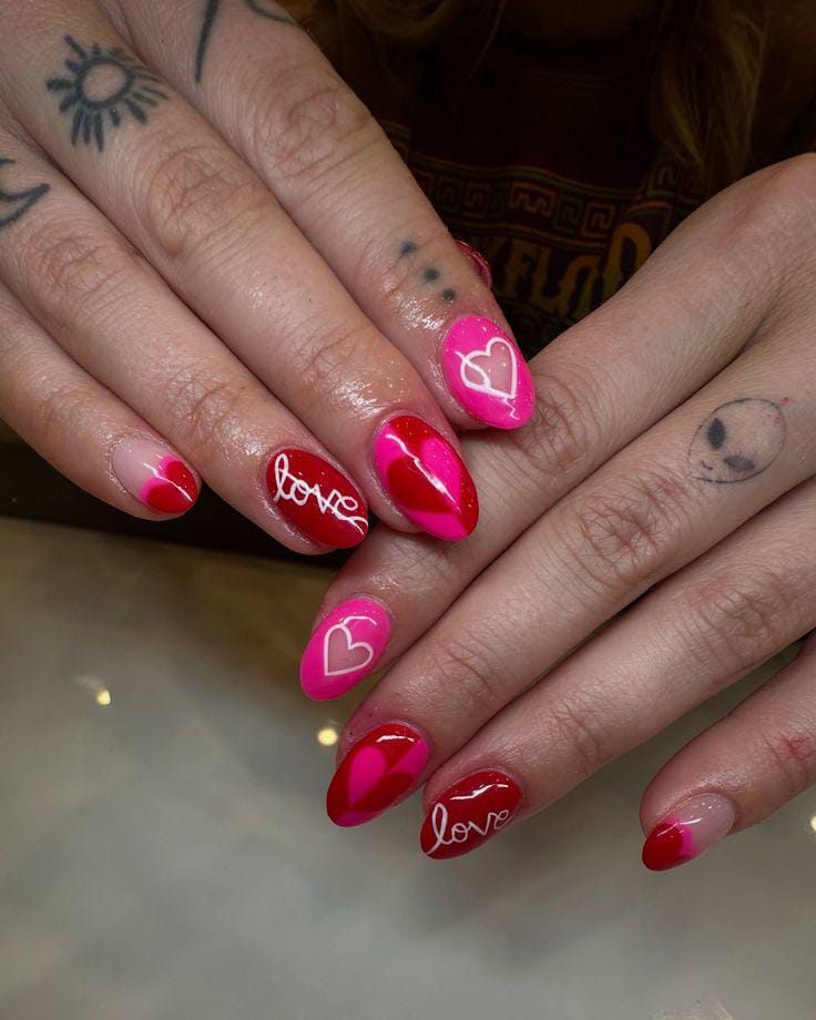 Bright pink and red nails feature hand-drawn hearts and “love” script details. The look is bold, romantic, and youthful with a handwritten fun Valentine’s charm.