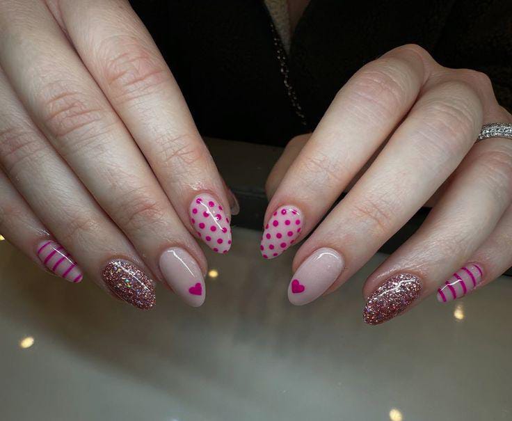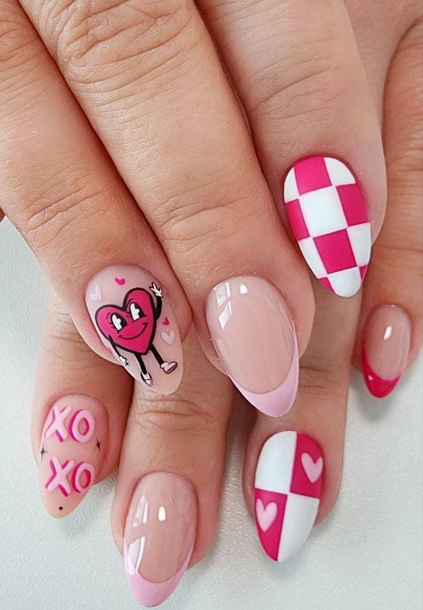 This design mixes nude and pink tones with hearts, checker patterns, and cute fun Valentine graphics. It feels bold, fun, and youthful, perfect for a statement Valentine’s manicure.
