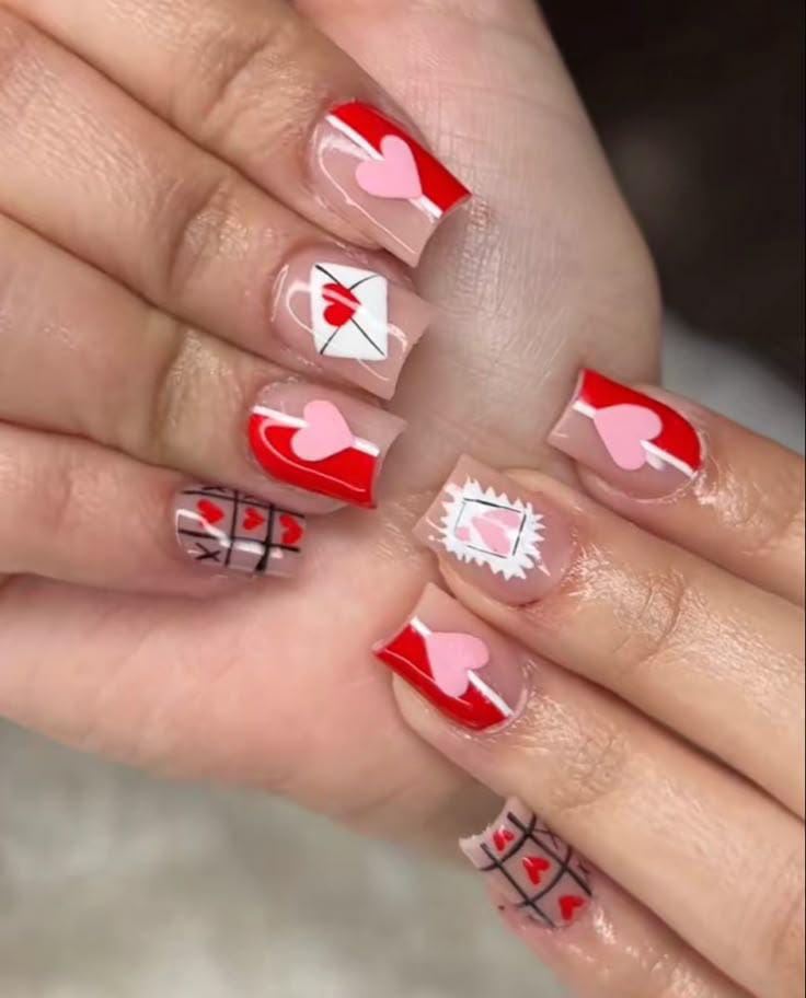 Red, nude, and white nails combine hearts, grid patterns, and stamp-style art. The overall vibe is creative, graphic, and fun inspired by Valentine love notes and postcards.
