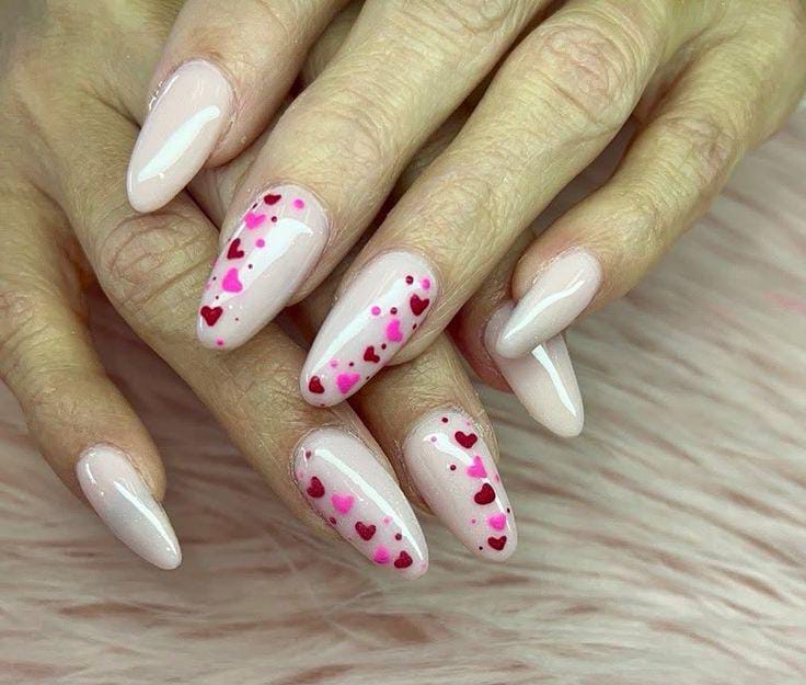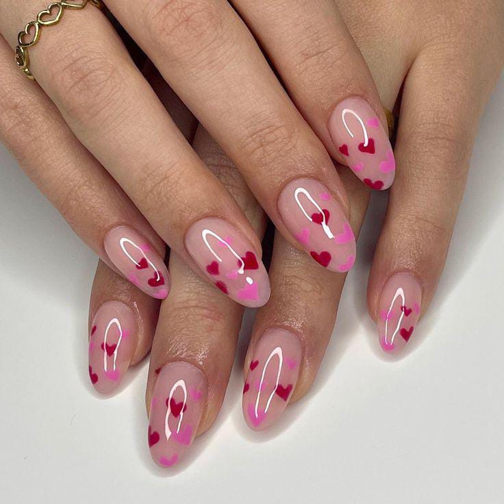Sheer nude nails are decorated with scattered pink and red hearts. The style is minimal, elegant, and sweet with a soft romantic fun Valentine’s finish.