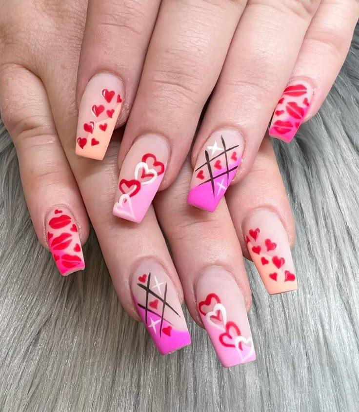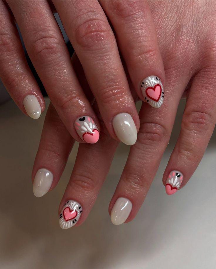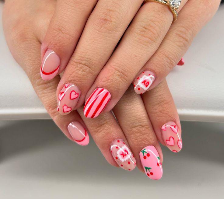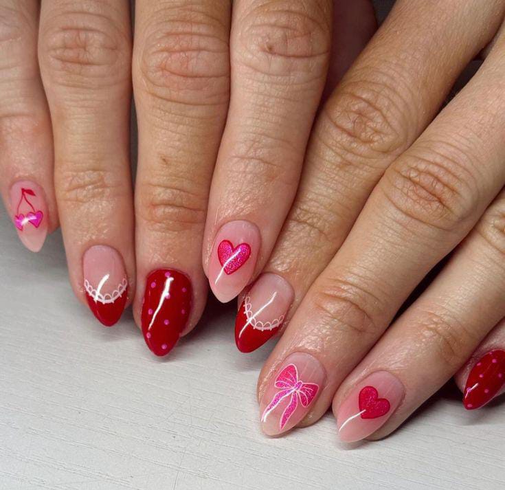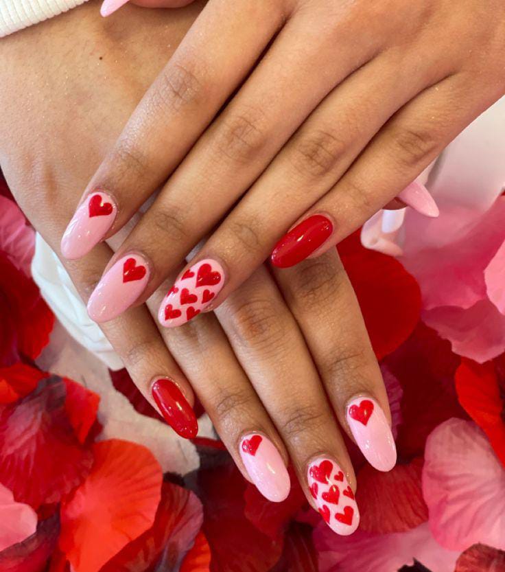 Classic red and blush nails are paired with heart-filled accent nails that feel romantic and eye-catching. The design balances bold color with cute patterns for a fun Valentine aesthetic.