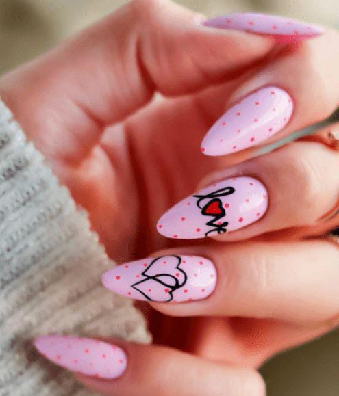 Light pink nails with tiny dots and hand-drawn heart details create a cute, cheerful look. The overall style feels playful, youthful, and perfect for a fun Valentine mood.