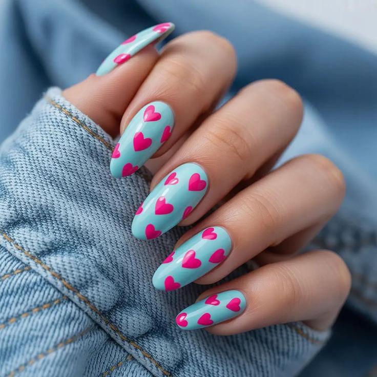 A pastel blue base covered in bright pink hearts gives this design a bold and fun contrast. The overall vibe is cheerful, youthful, and inspired by classic Valentine candy colors.