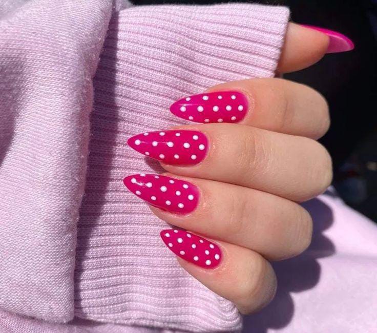 Bright pink nails with playful white polka dots create a fun, flirty Valentine vibe. The look feels youthful, cheerful, and perfect for a cute, casual style.