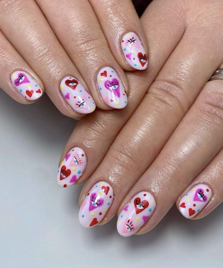 These nails feature a soft pink base with cute hand-drawn hearts, lips, and eye motifs in bright red and pastel tones. The overall vibe is fun, quirky, and artsy, perfect for a cheerful fun Valentine’s look.