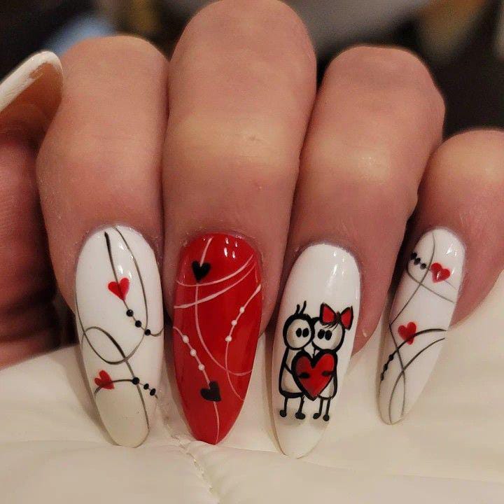 Red and white nails are decorated with fine line hearts and an adorable cartoon couple holding a heart. The style is playful and romantic, giving a sweet storybook and fun Valentine vibe.
