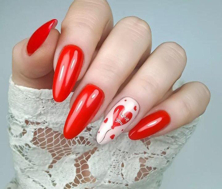 Bold glossy red nails are paired with a soft nude accent nail featuring tiny hearts and a love message. The look is clean, modern, and romantic with a strong fun Valentine statement.