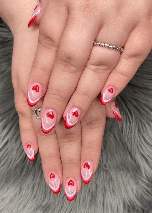 A nude base is paired with red and white heart-shaped tips for a fresh, modern take on fun Valentine nails. The look is soft, stylish, and subtly playful.