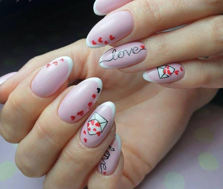 Soft pink French tips are paired with tiny red hearts, envelope art, and handwritten “love” details. The vibe is sweet, romantic, and playful with a fun Valentine’s card aesthetic.