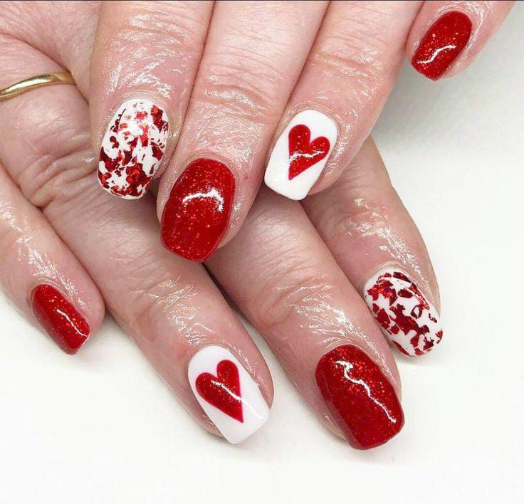 Glossy red nails are combined with white accent nails featuring bold red hearts and textured details. This design feels timeless, elegant, and strongly fun Valentine-inspired.