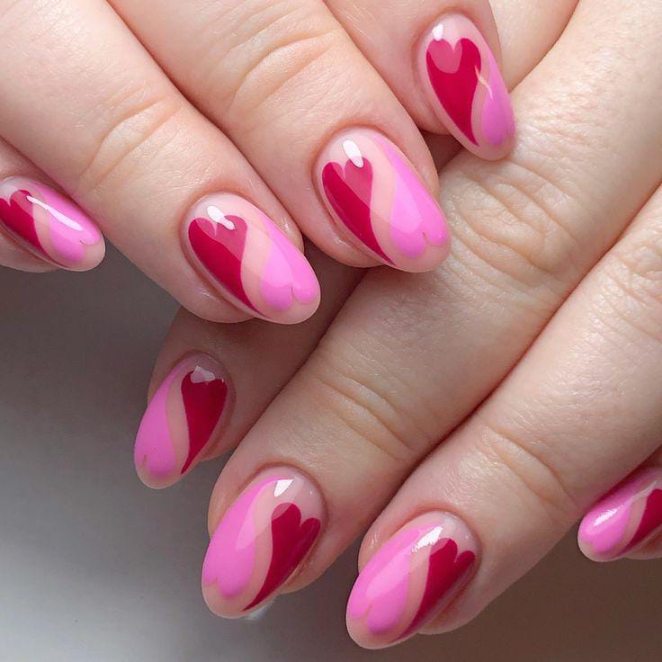 Layers of pink and red blend into smooth heart-shaped swirls across the nails. The design feels soft, cute, and artistic with a fun Valentine’s mood.