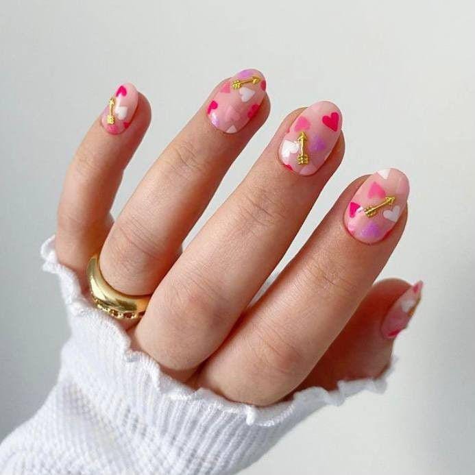 Light pink nails are decorated with tiny hearts and delicate gold arrow details for a fun Valentine theme. The overall vibe is sweet, playful, and slightly dreamy.