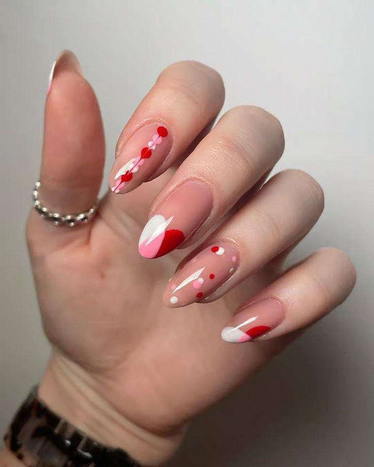 This design features a soft nude base with playful red and pink heart accents mixed with delicate dots and sparkly details. The overall vibe is cute, romantic, and lighthearted with a fun Valentine twist.