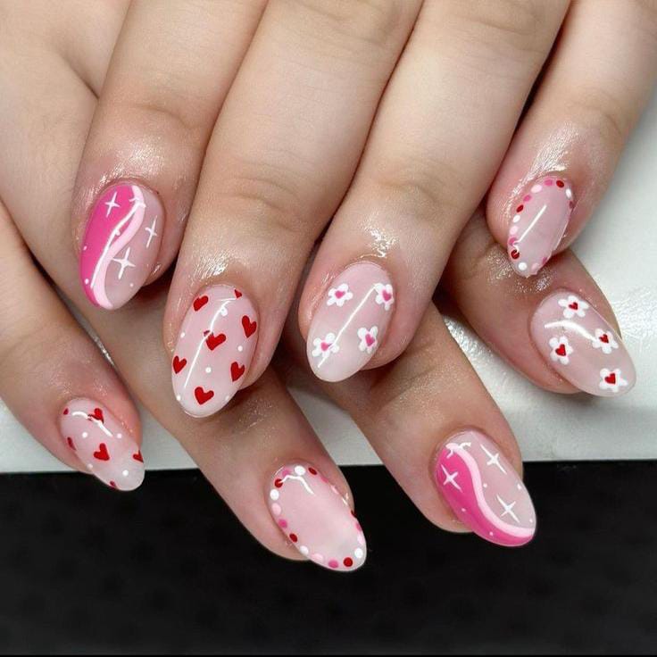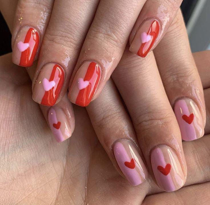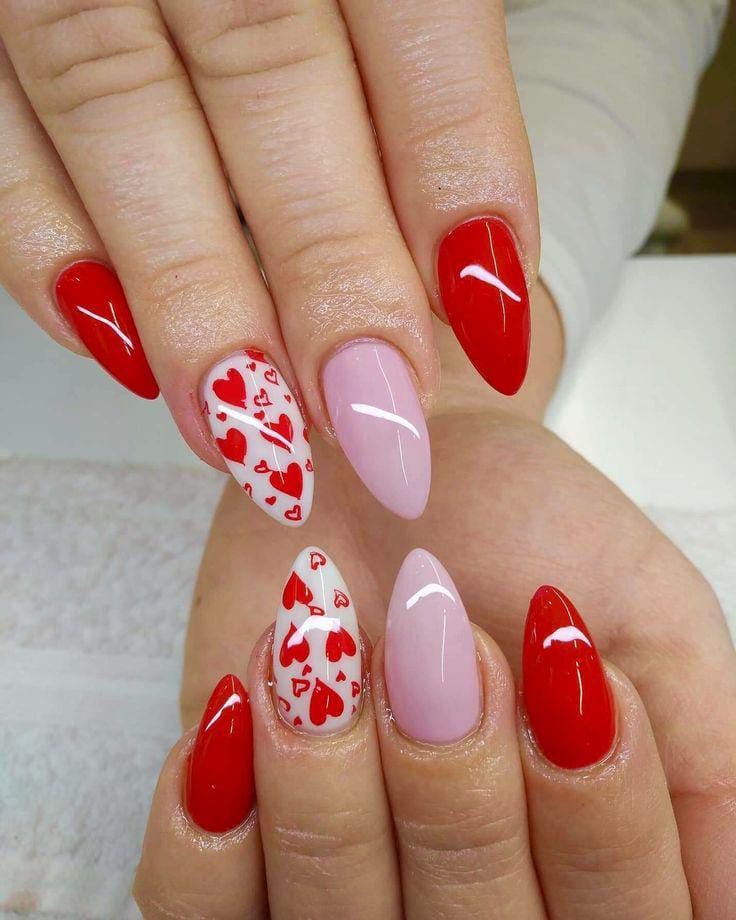 A combination of glossy red and soft pink nails decorated with simple heart patterns creates a timeless Valentine look. The design feels sweet, romantic, and perfect for a fun festive occasion.