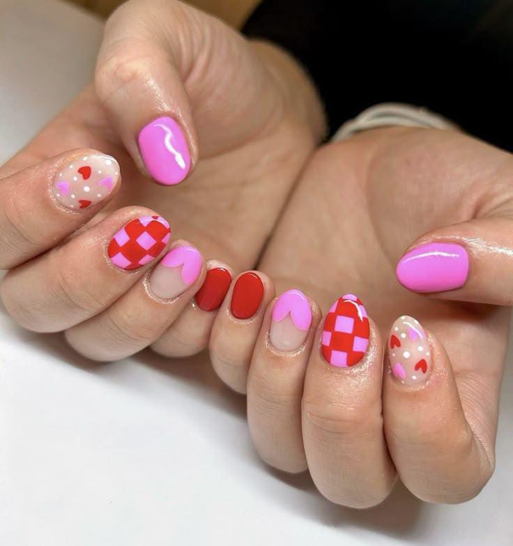 Bright pinks, reds, and nude tones come together with heart patterns and checker-style accents. The design feels fun, bold, and youthful with a cheerful Valentine energy.