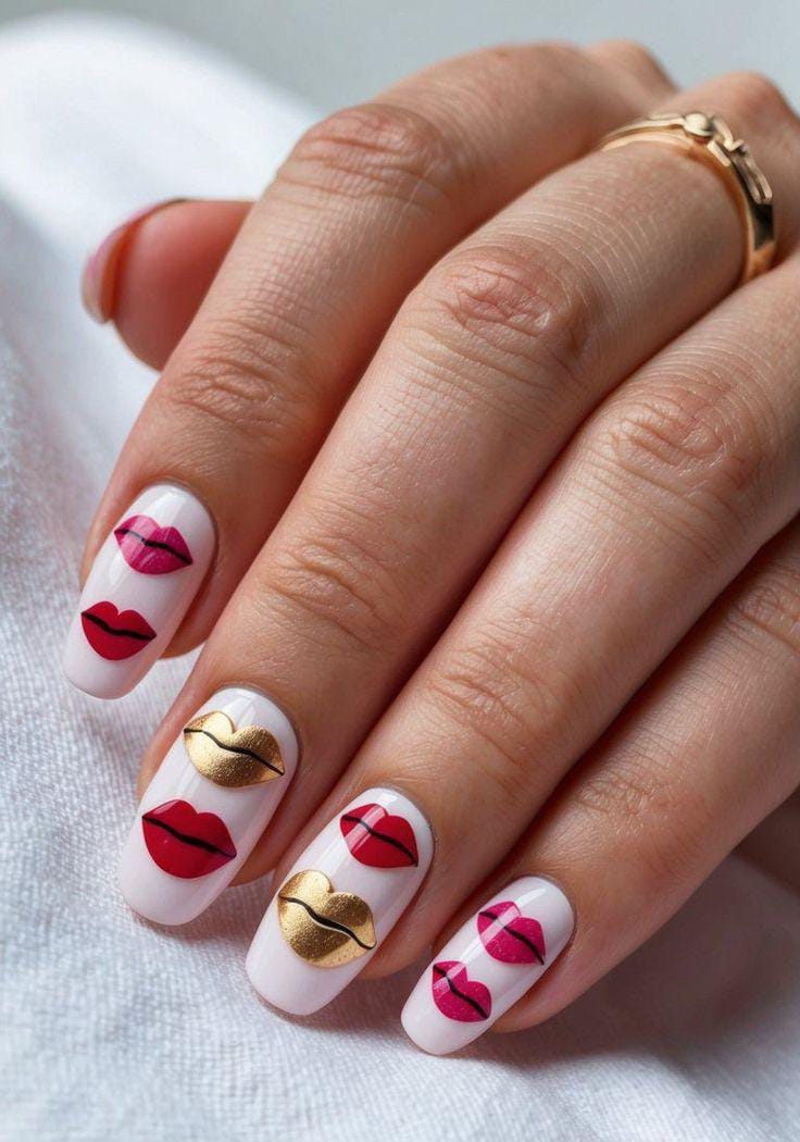 A clean white base is decorated with bold red, pink, and metallic gold lip prints for a fun, statement-style manicure. The mix of glossy and metallic finishes gives it a chic yet playful fun Valentine vibe.