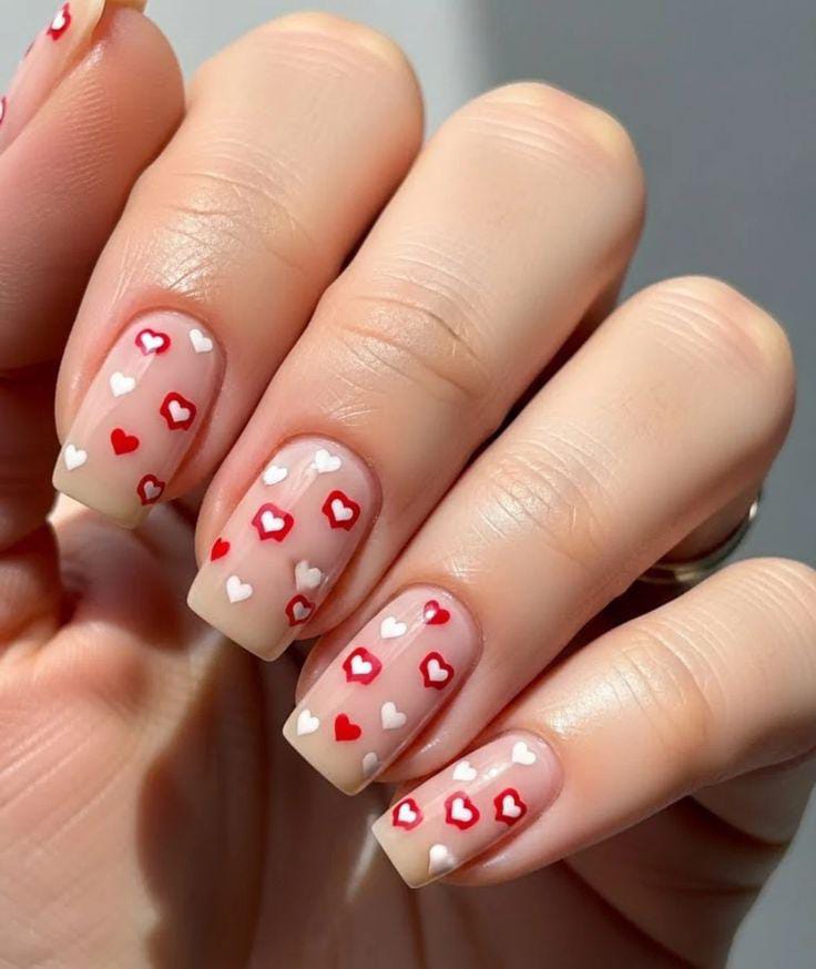 A sheer nude base is sprinkled with small red and white hearts, creating a soft and charming look. This design feels light, cute, and perfect for an understated fun Valentine style.