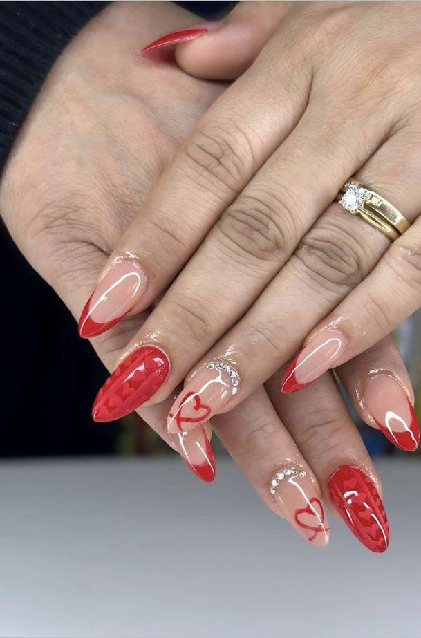 Red, pink, and nude tones come together with tiny hearts and subtle rhinestone accents. This design feels bold yet feminine, adding a glamorous twist to fun Valentine nails.